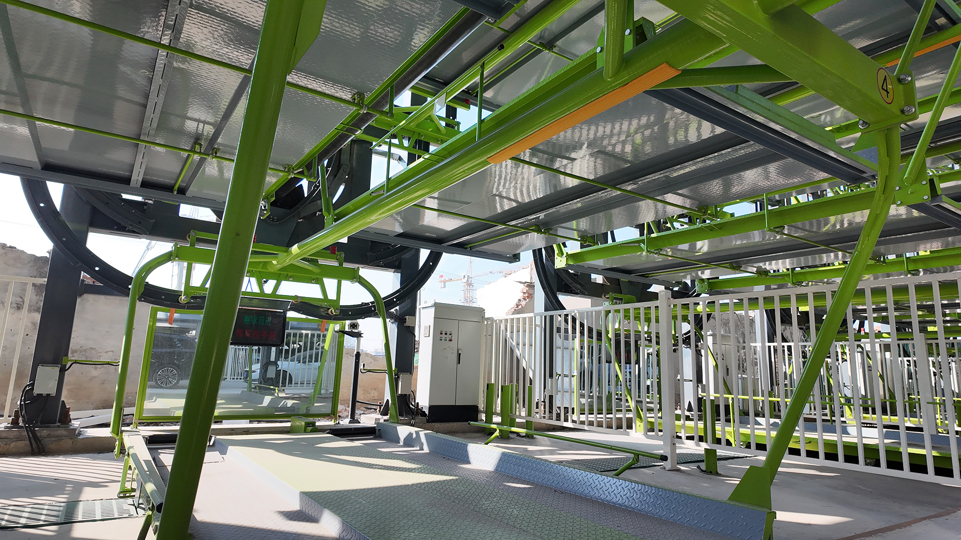 該類設備主要由主體鋼結構、吊籃結構、傳動系統、控制系統、安全保護裝置等部分組成。其主體結構內部設置固定導軌,提升鏈條滾輪在該導軌內運行,載車板懸掛在提升鏈條外伸三角板上。工作時,車輛停放在載車板內部,鏈條傳動系統帶動載車板在垂直方向上循環運轉,當載車板運行到設備底部時,可進行車輛的存取作業。