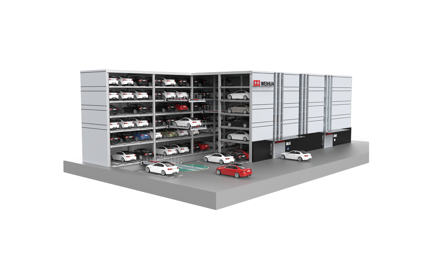 該類停車設備采用與立體倉庫類似的原理和結構,空間利用率高。采用封閉式結構,無需出車道或搬運通道,利用車位間移動旋轉再由升降機配合實現出車。該系統可在升降機和停車層面任意